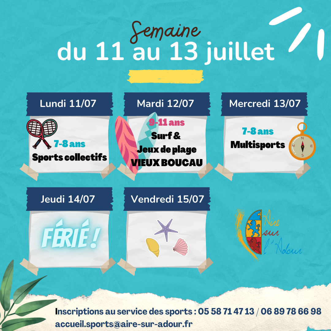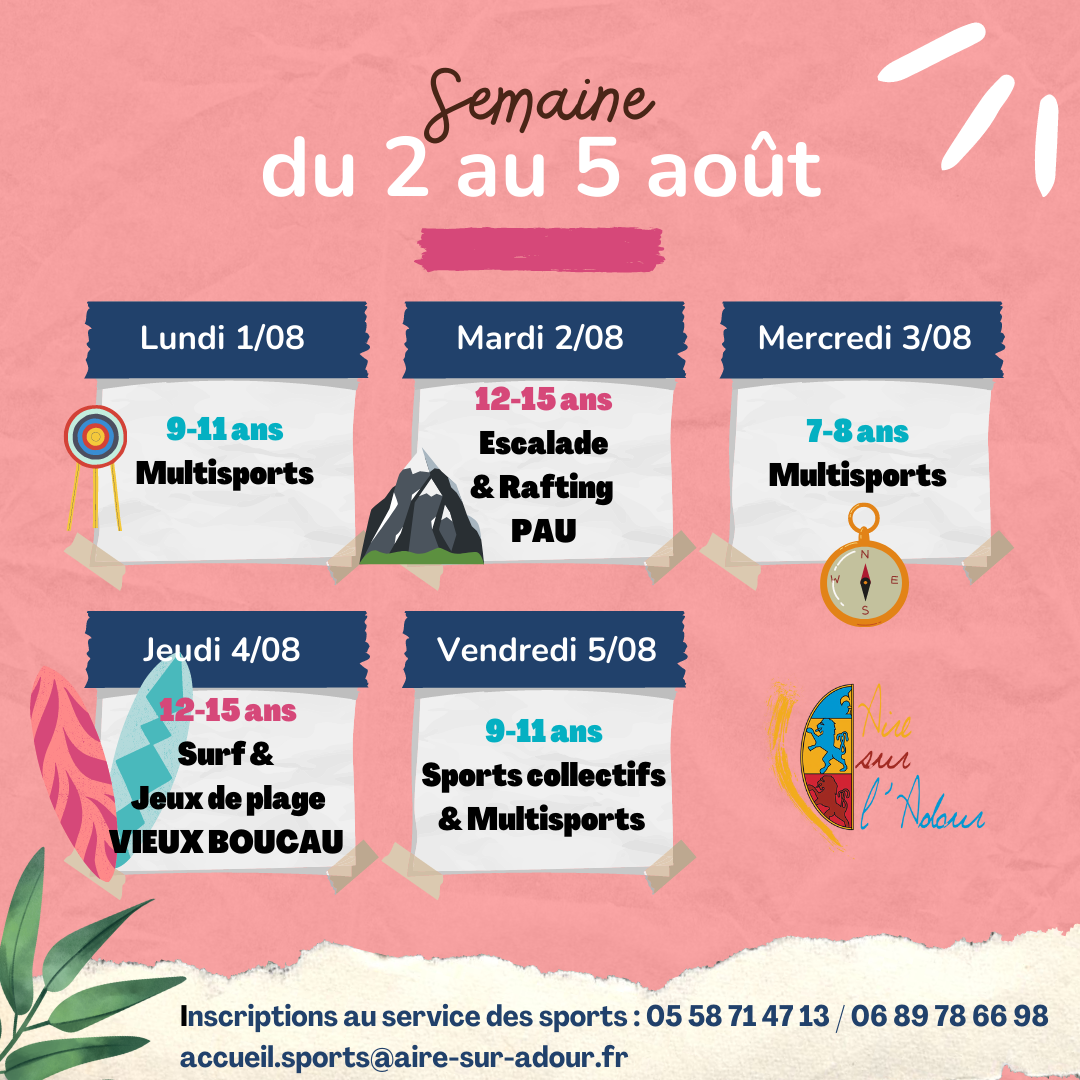 À quelques jours des vacances d’été, prévoyez le plein d’activités pour vos enfants. Du 11 juillet au 5 août 2022, l’école municipale des sports offre l’opportunité aux jeunes aturins de découvrir une multitude de disciplines sportives. Encadrés par les éducateurs sportifs de la ville, les enfants de 7 à 11 ans pourront s’initier aux sports collectifs (tennis, badminton, volley…) ou à d’autres activités comme le tir à l’arc, la course d’orientation, l’athlétisme, le run & bike, etc. Trois journées dédiées au surf et au rafting seront organisées pour les 9-11 ans. Consultez vite le programme !