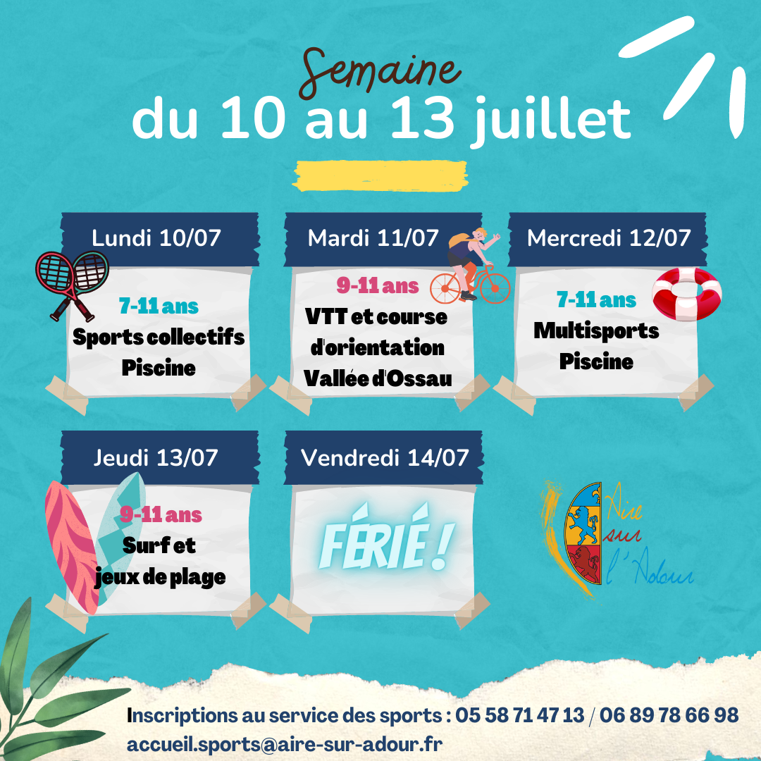 À quelques jours des vacances d’été, prévoyez le plein d’activités pour vos enfants. Du 10 juillet au 4 août 2023, l’école municipale des sports offre l’opportunité aux jeunes aturins de découvrir une multitude de disciplines sportives. Encadrés par les éducateurs sportifs de la ville, les enfants de 7 à 11 ans pourront s’initier aux sports collectifs (tennis, badminton, volley…) ou à d’autres activités comme le tir à l’arc, la course d’orientation, l’athlétisme, la piscine (participation demandée de 5€), etc. Sept journées dédiées au surf, au rafting et au VTT seront organisées pour les 9-11 ans et 12-15 ans. Consultez vite le programme !