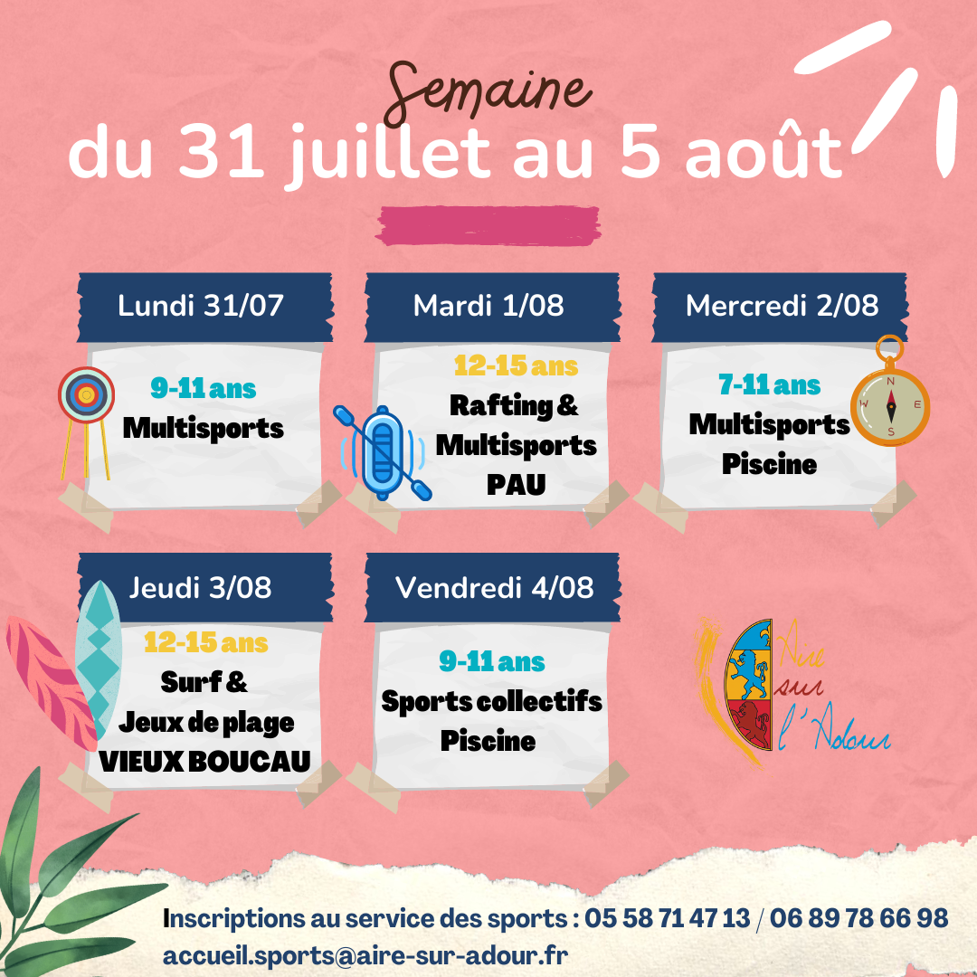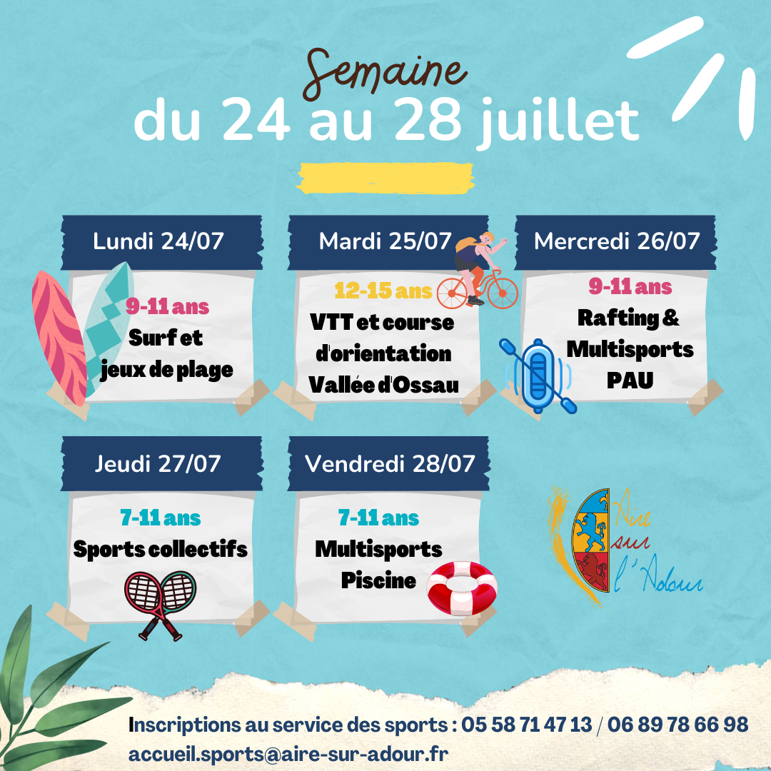 À quelques jours des vacances d’été, prévoyez le plein d’activités pour vos enfants. Du 10 juillet au 4 août 2023, l’école municipale des sports offre l’opportunité aux jeunes aturins de découvrir une multitude de disciplines sportives. Encadrés par les éducateurs sportifs de la ville, les enfants de 7 à 11 ans pourront s’initier aux sports collectifs (tennis, badminton, volley…) ou à d’autres activités comme le tir à l’arc, la course d’orientation, l’athlétisme, la piscine (participation demandée de 5€), etc. Sept journées dédiées au surf, au rafting et au VTT seront organisées pour les 9-11 ans et 12-15 ans. Consultez vite le programme !