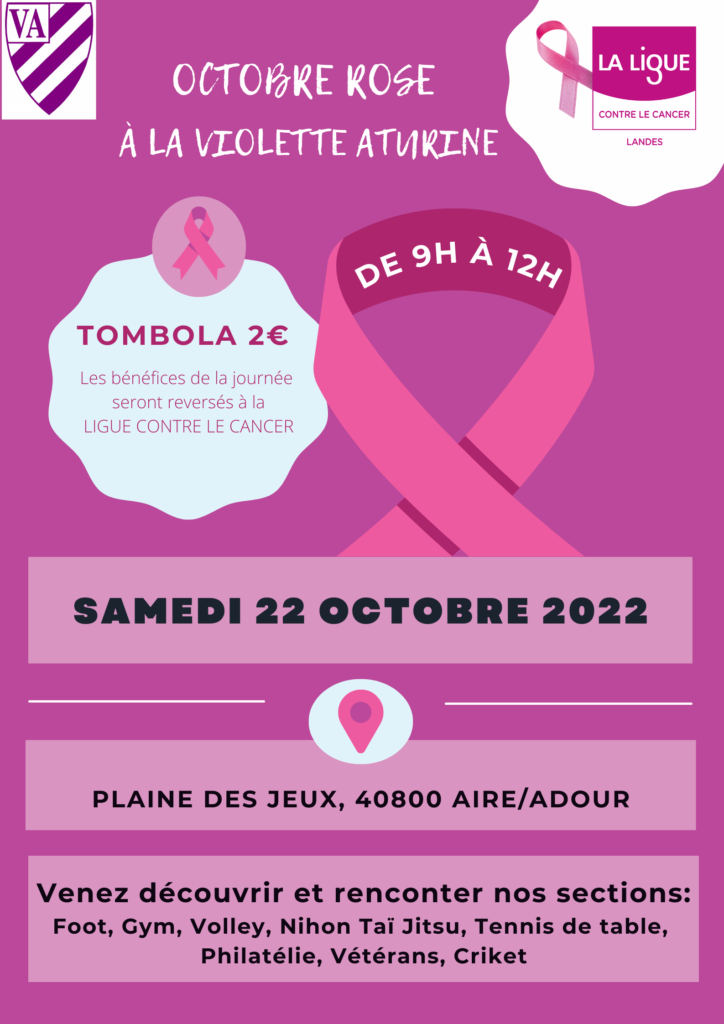 De 9h à 12h, venez découvrir et rencontrer toutes les sections de la Violette Aturine : foot, gymnastique, volley, Nihon Taï Jitsu, Tennis de table, Philatélie, Vétérans, Criket. Participez aussi à la tombola (2€ le ticket) dont les bénéfices seront entièrement reversés à la Ligue contre le cancer.
