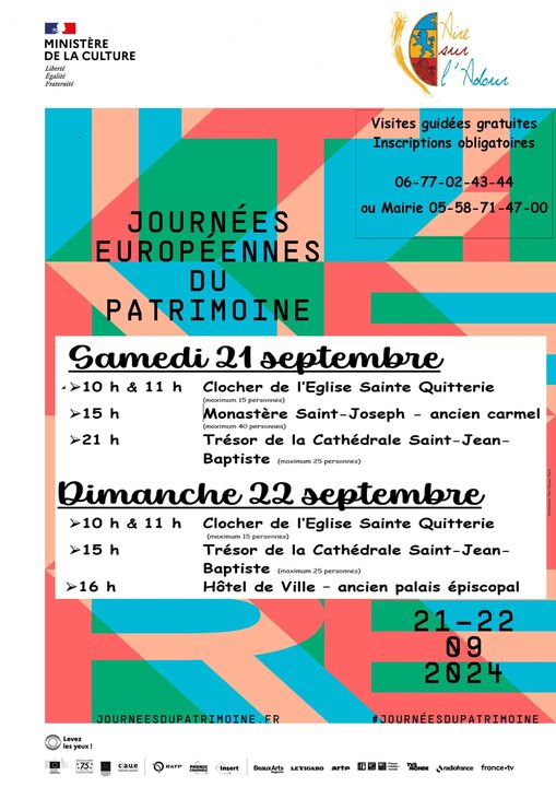 À l’occasion des Journées Européennes du Patrimoine, veuillez trouver le programme des visites guidées organisées par le service Patrimoine de la ville. Clocher de l’église Sainte-Quitterie : à 10H00 et 11H00 samedi 21 et dimanche 22 septembre. Monastère Saint-Joseph (ancien…
