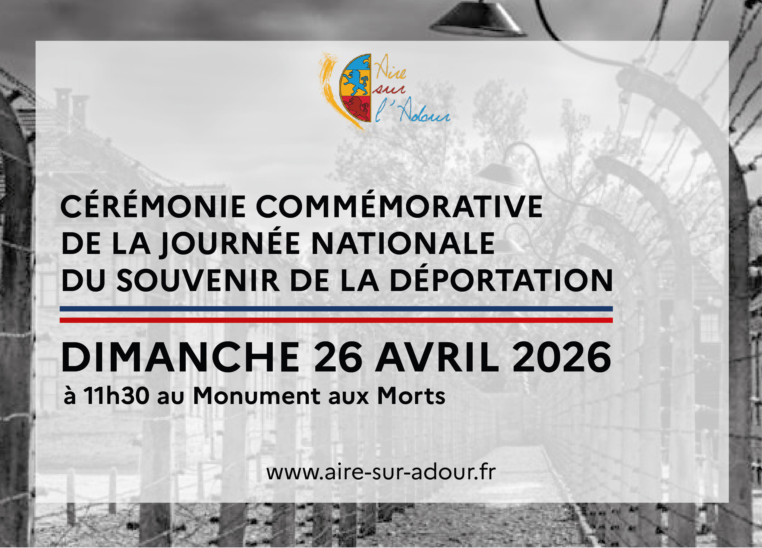 La Ville d’Aire sur l’Adour vous invite à participer à la cérémonie de la Journée nationale du souvenir de la déportation, le dimanche 26 avril 2026 à 11h30, au Monument aux Morts.