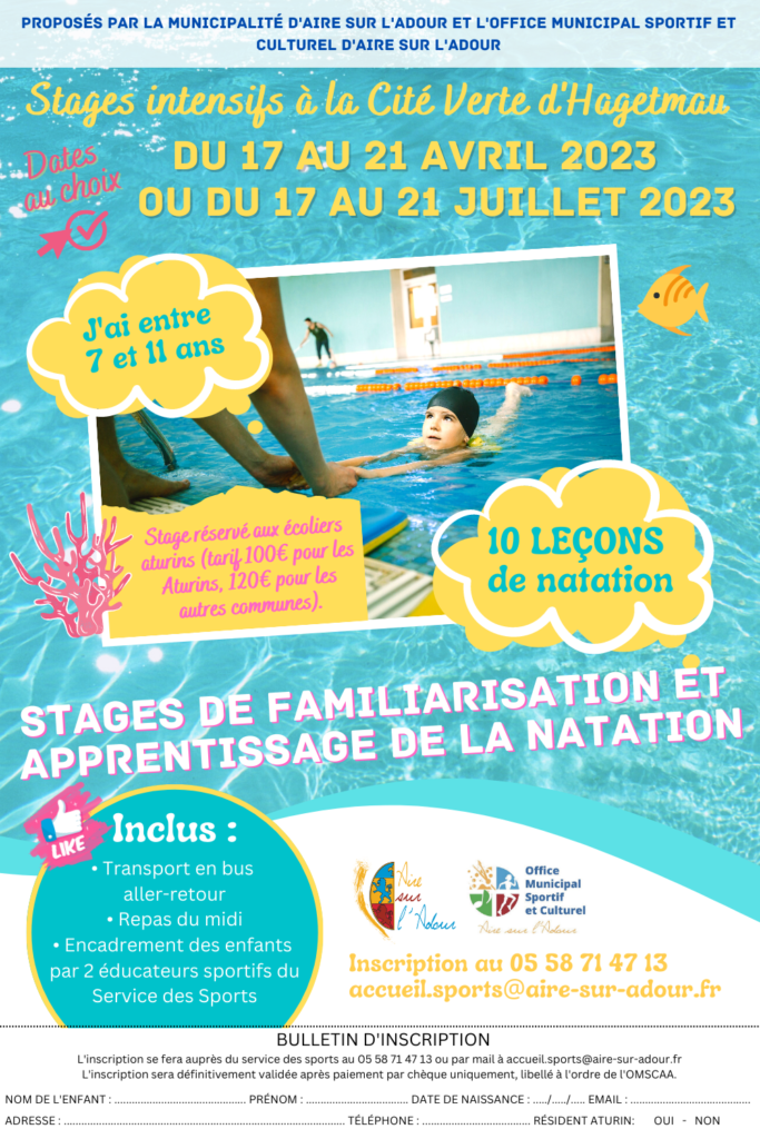 L’école municipale des sports, en partenariat avec l’OMSC d’Aire sur l’Adour, organise deux stages de natation pour les écoliers aturins : du 17 au 21 avril 2023 et du 17 au 21 juillet 2023. Les inscriptions sont dès à présent ouvertes !