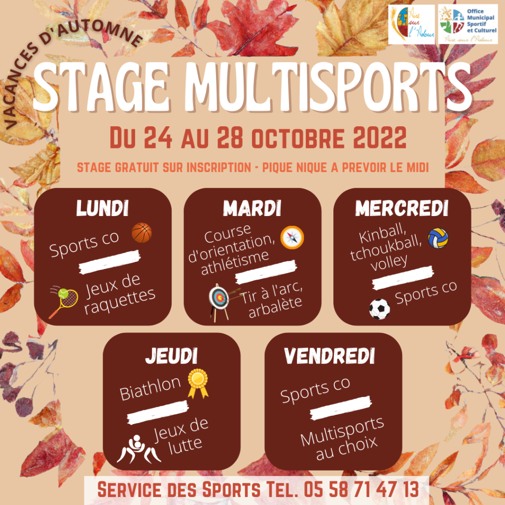 Votre enfant ne sait pas quoi faire pendant ces vacances ? Du 24 au 28 octobre 2022, le service des sports d’Aire sur l’Adour propose aux enfants de 8 à 11 ans un stage multisports de 5 jours en remplacement du stage d’apprentissage à la nage reporté au printemps 2023.