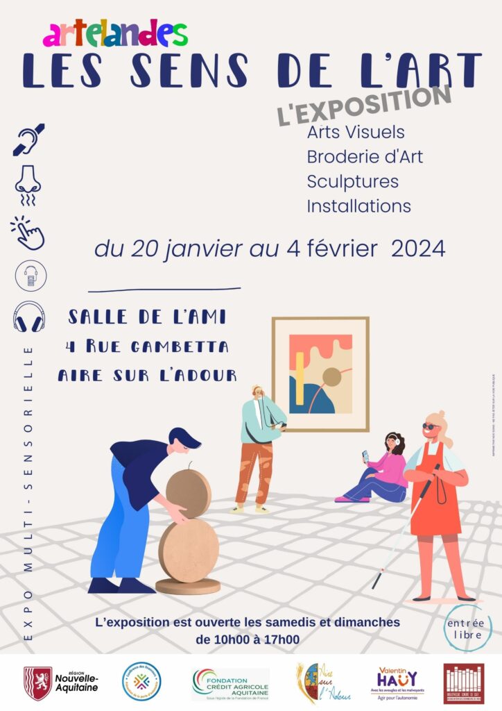 Du 20 janvier au 4 février 2024, la municipalité accueille l’exposition itinérante, unique et originale, réalisée par l’association ArteLandes. Il s’agit d’une exposition multisensorielle, nommée « Les Sens de l’Art », qui s’adresse à un public très large. Elle sera ouverte au public les samedis et dimanches de 10h à 17h à la salle de l’AMI (4 rue Gambetta) avec l’entrée gratuite. Les visiteurs seront accueillis par les artistes eux-mêmes pour découvrir les œuvres d’art présentées.