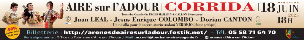 - À 18h : Corrida avec Juan Leal, Jesus Enrique Colombo et Dorian Canton pour les toros Pages Mailhan et Gallon Frères. Billetterie à l’Office de Tourisme à Aire sur l’Adour ou au 05.58.71.64.70 mais aussi sur internet sur http://arenesdeairesurladour.festik.net/