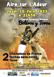 - 21h30 : Course Landaise Festival « Boléros y Toros » aux arènes Maurice Lauche. Billetterie à l’Office de Tourisme à partir du 1er juin au 05 58 71 64 70. Tarifs : entrée générale à 16€, licenciés et AJC à 5€, gratuit jusqu’à 12 ans inclus.
