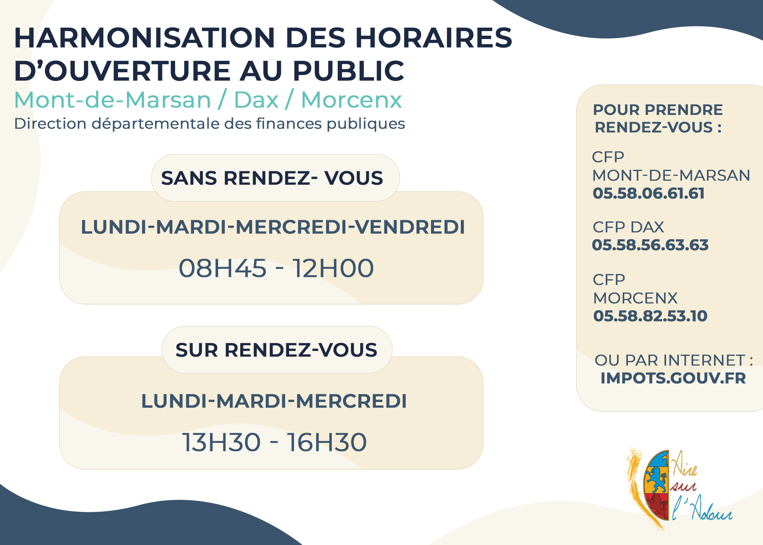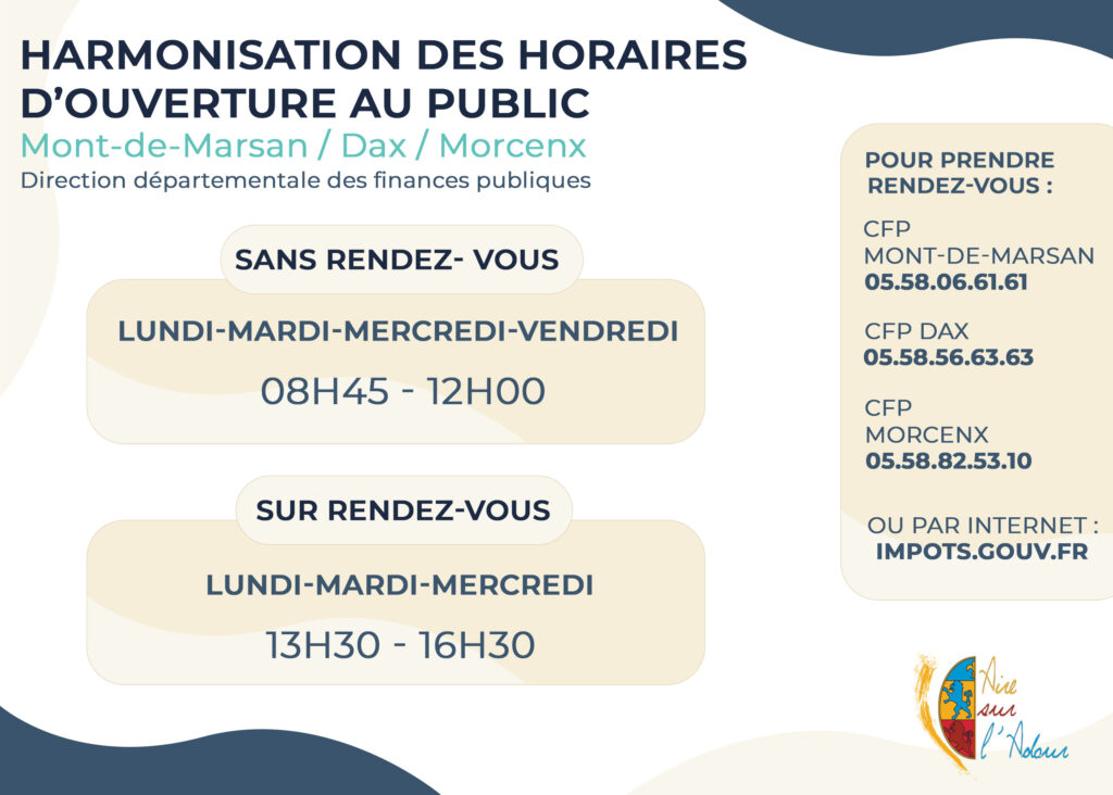 Les services d’accueil au public des finances publiques de Mont-de-Marsan, Dax et Morcenx synchronisent leurs horaires: