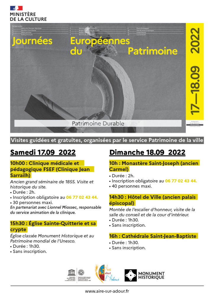 Les 17 et 18 septembre 2022 se tiendra la 39ème édition des Journées Européennes du Patrimoine qui célèbrera cette année le patrimoine durable. À cette occasion, le service Patrimoine de la ville vous propose de (re)découvrir les sites incontournables de notre belle ville : l’église Sainte-Quitterie et sa crypte, la Cathédrale Saint Jean-Baptiste, l’Hôtel de Ville (ancien palais épiscopal), le Monastère Saint Joseph (ancien Carmel) ou encore la Clinique médicale et pédagogique FSEF (Clinique Jean Sarrailh).