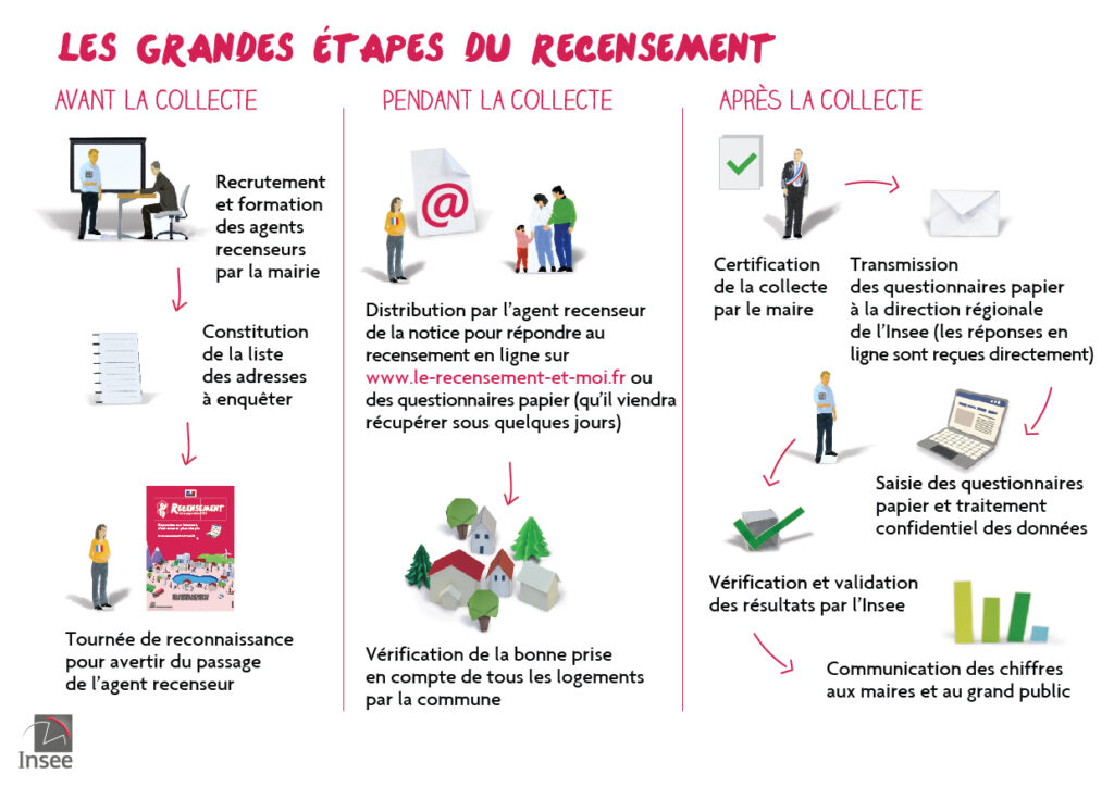 Formés par l’INSEE, les agents recenseurs devront tout d’abord mener une tournée de reconnaissance pour repérer les logements et avertir de leur passage. Ils seront ensuite amenés à se présenter chez les habitants pour leur remettre en main propre la notice de recensement et la récupérer si cette démarche ne peut être faite en ligne. En effet, le protocole de l’enquête ayant évolué, la réponse au questionnaire peut se faire maintenant par internet.