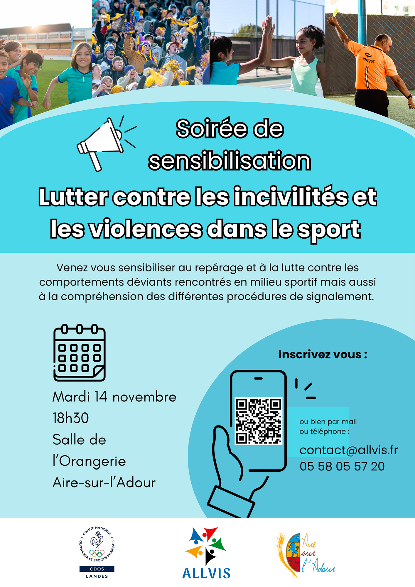 Dans le cadre du dispositif ALLVIS (Accompagnement Landais pour la Lutte contre les Violences et les Incivilités dans le Sport), le CDOS des Landes organise une soirée de sensibilisation pour lutter contre les incivilités et les violences dans le milieu du sport à destinations de tous les acteurs sportifs : présidents d’associations sportives, encadrants sportifs, bénévoles …