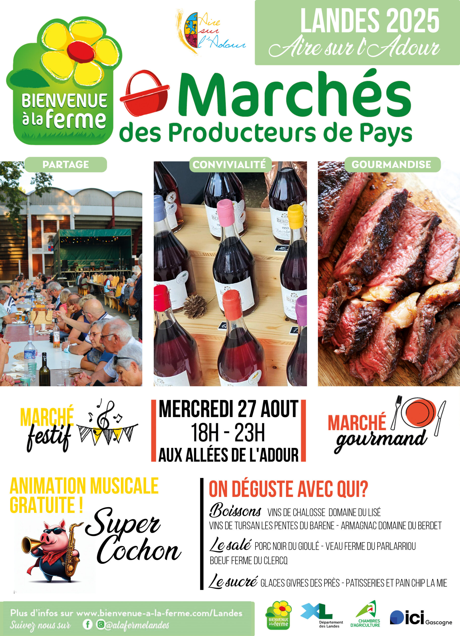 #MarchéDesProducteurs #ProduitsLocaux #AireSurLAdour #SortieEstivale #GastronomieLocale #ConcertGratuit #SuperCochons