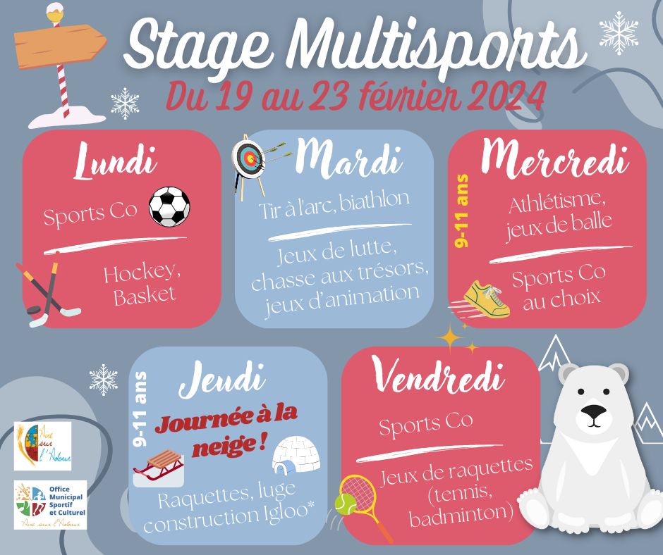 Du 19 au 23 février 2024, de nombreuses activités vont être proposées à la plaine des jeux : sports collectifs, tennis, badminton, course d’orientation, athlétisme, tir à l’arc, volley, football, biathlon, jeux de lutte, etc… Et le jeudi 22 février 2024, les éducateurs sportifs ont prévu une journée entière à la neige dans la Vallée d’Ossau.