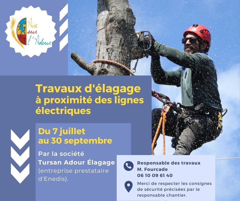 Des travaux d’élagage nécessaires à l’entretien des lignes électriques ont été entrepris sur la commune et vont durer jusqu’au 30 septembre 2022. Tous les propriétaires concernés ont déjà été prévenus par courrier.