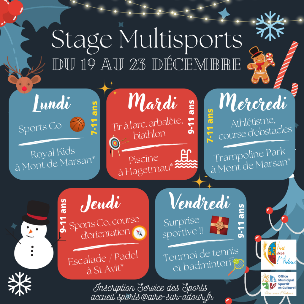 👉 Mettez des paillettes dans les yeux de votre enfant 🤩 en attendant Noël. Faites-le participer au super programme sportif prévu 𝗱𝘂 𝟭𝟵 𝗮𝘂 𝟮𝟯 𝗱𝗲́𝗰𝗲𝗺𝗯𝗿𝗲 par le service des sports de la ville. De nombreuses activités vont être organisées à la plaine des jeux et en extérieur. Entre tournois sportifs, sports collectifs, sortie à la piscine d’Hagetmau, sorties au Royal Kids et Trampoline Park de Mont de Marsan, en passant par le biathlon, l’escalade et le padel … les enfants ne vont certainement pas s’ennuyer ! 💚👍❤️